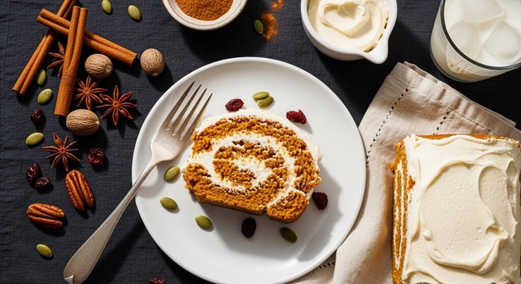 Once you’ve nailed your perfect pumpkin roll—whether you’ve kept it classic or loaded it with your own creative tweaks—the real fun starts: figuring out what goes alongside it. I’d pair thick slices with strong coffee or spiced chai for balance. Whipped cream works, but honestly, the filling’s already rich enough. Want something lighter? Try vanilla yogurt or a scoop of cinnamon ice cream. Hot apple cider complements it beautifully too. For breakfast vibes, I’d serve smaller portions with scrambled eggs nearby. The cake’s sweet and dense, so you’ll want something to cut through all that pumpkin goodness.